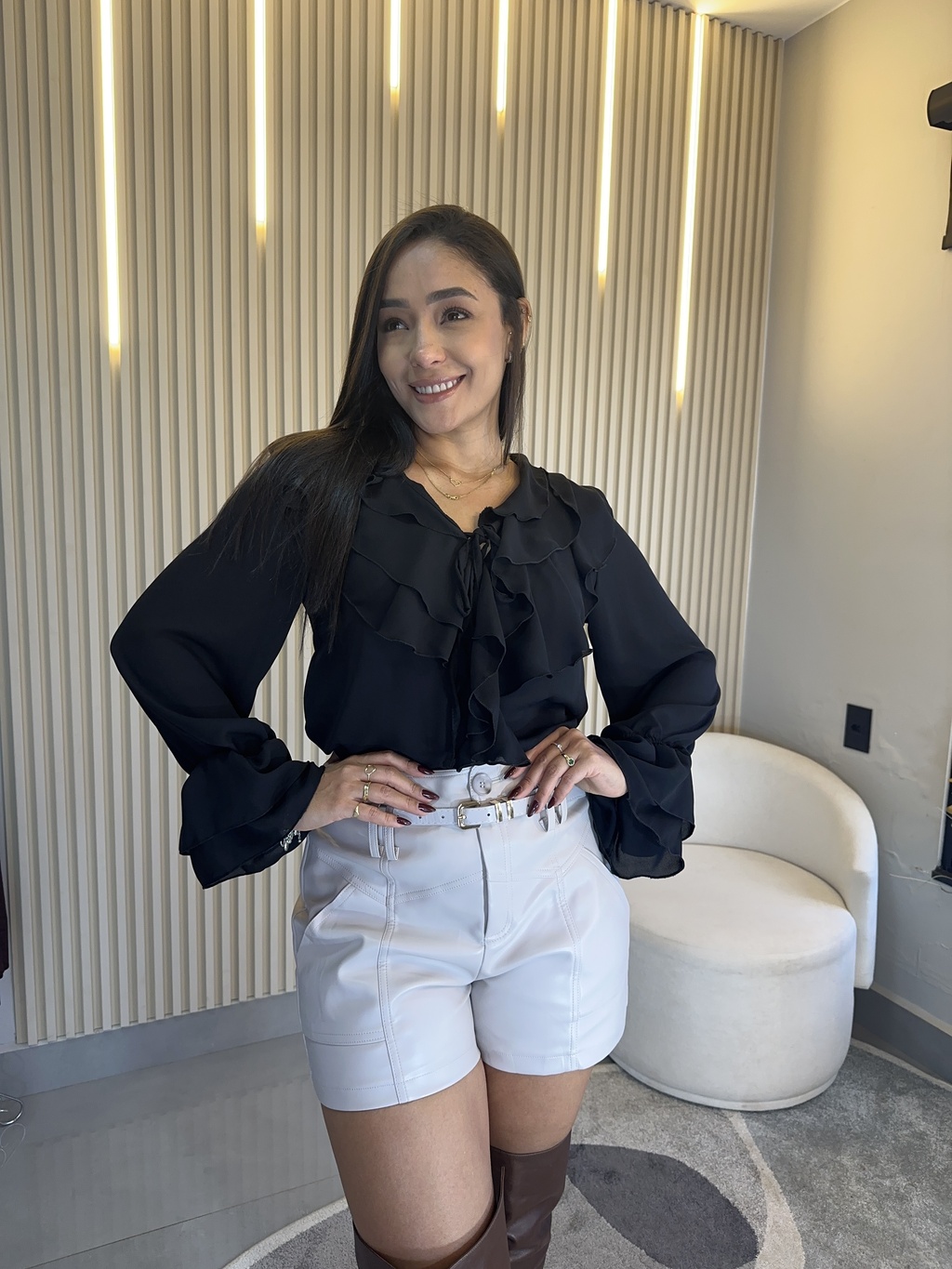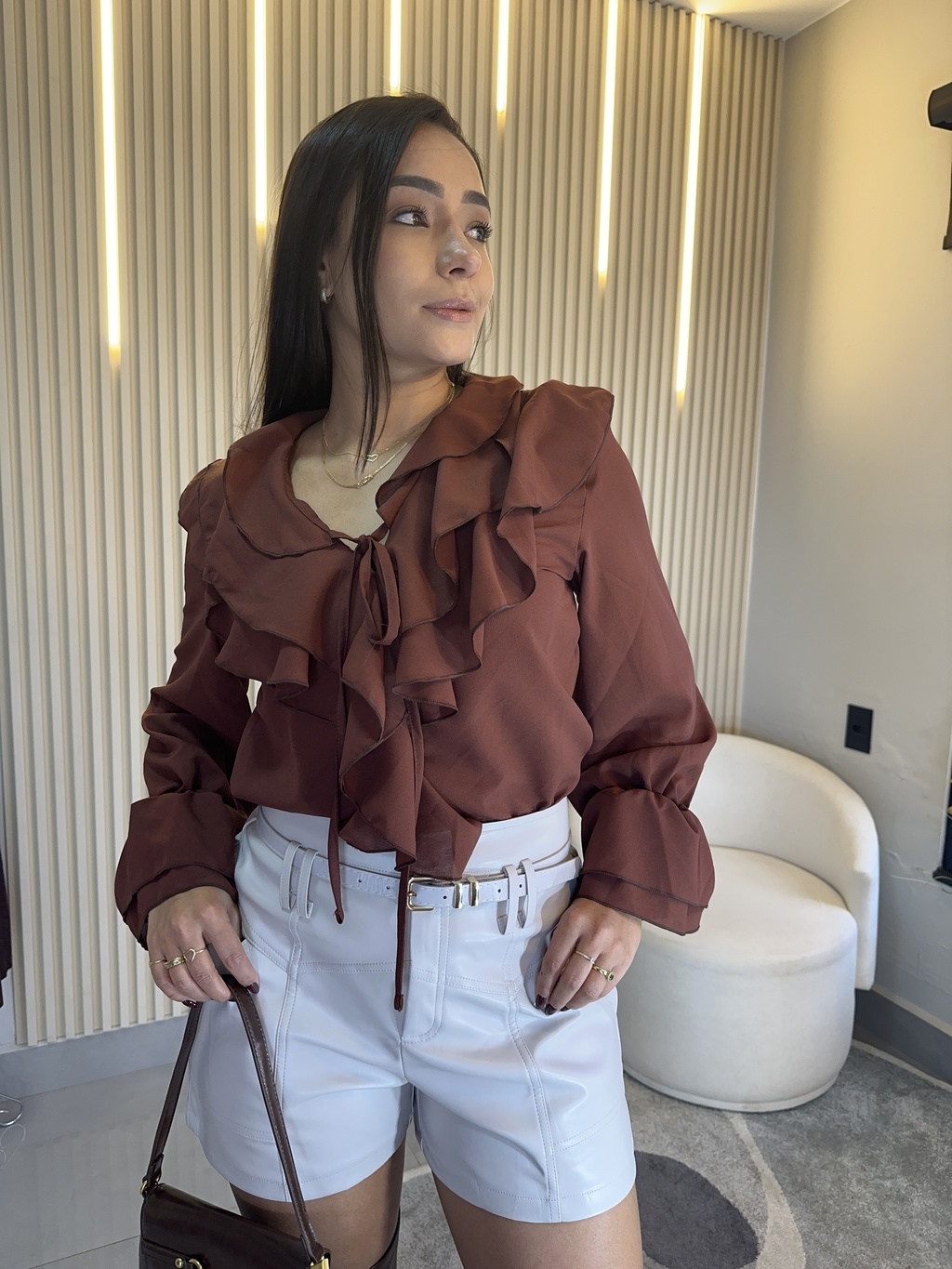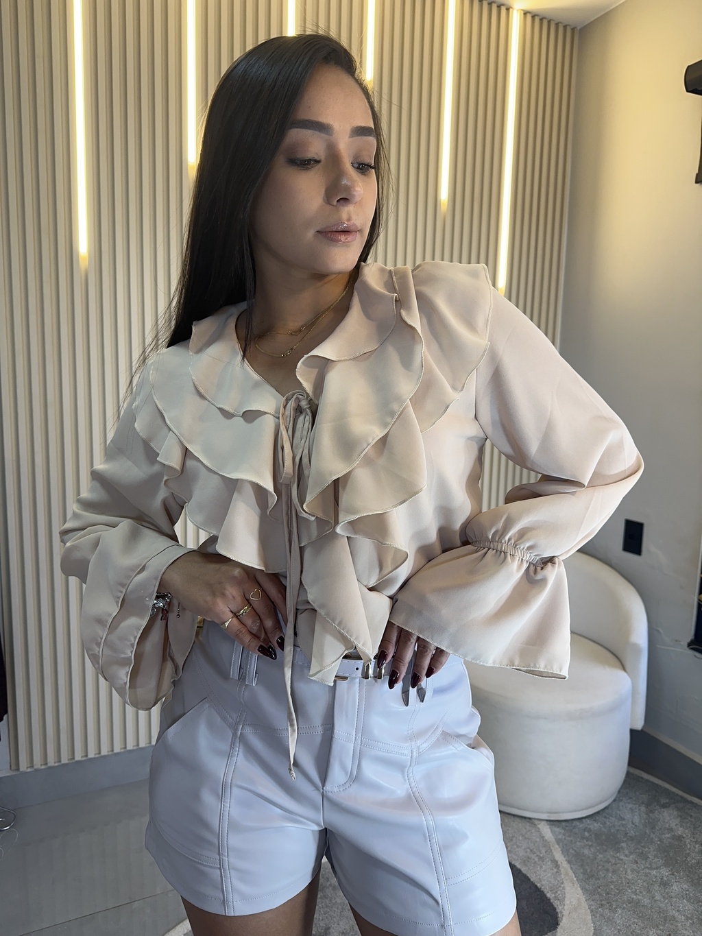 No busto, os babados duplos e o detalhe de amarração adicionam um toque romântico e atemporal — perfeito para compor desde produções delicadas para o dia até looks mais refinados à noite.