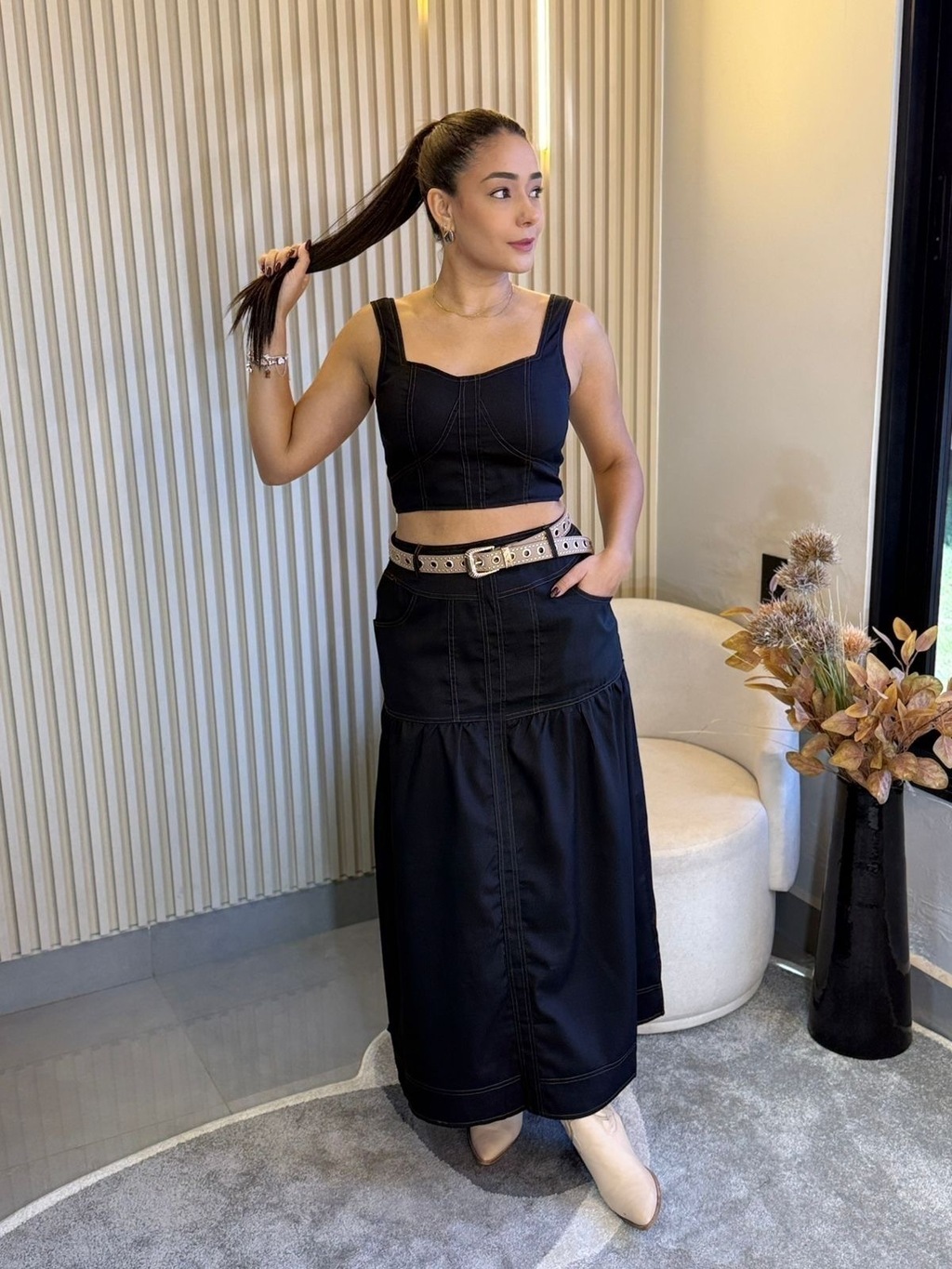 O Conjunto Laura traz o equilíbrio ideal entre modernidade e romantismo. A saia longa tem caimento fluido, recortes que valorizam a silhueta e forro interno que garante conforto. O zíper traseiro confere praticidade, enquanto o design com leve volume na barra adiciona charme ao movimento.